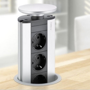De Evoline Port is een mooie én practische oplossing voor extra stopcontacten. Met één vinger kan de port in het werkbladof het aanrecht zakken en wanneer nodig weer te voorschijn gehaald worden. De Evoline Port wordt geleverd in verschillende uitvoeringen met 2 of drie geaarde stopcontacten. De kleur van de deksel is zilvergrijs, zwart of RVS. De inbouwmaat is rond 102mm en geschikt voor bladen tot 50mm dik.